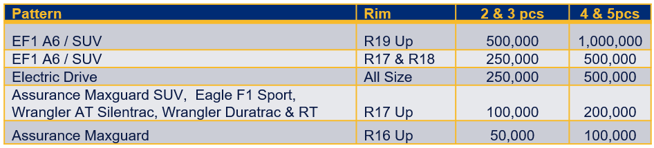 - Minimum pembelian 2 (dua) unit ban Consumer R16” ke atas tipe tertentu.